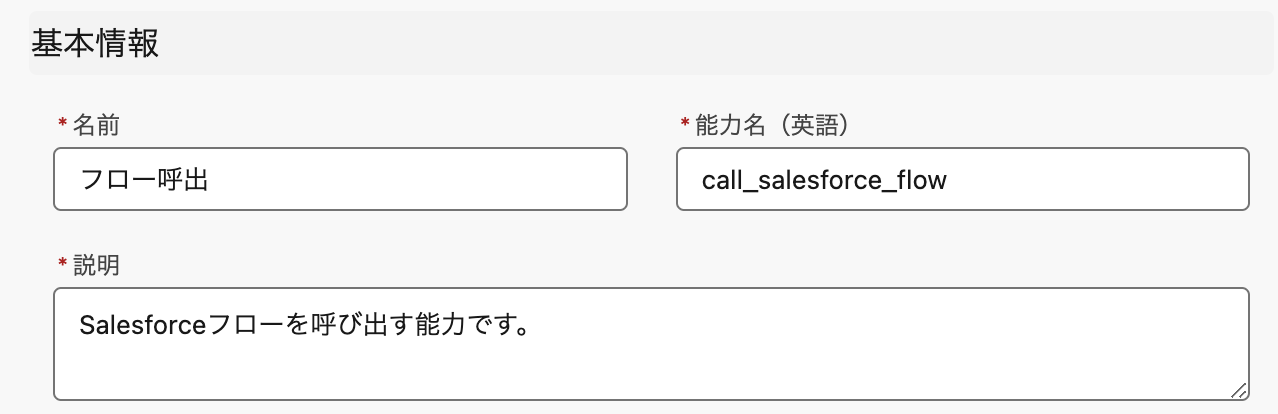 「フロー呼出」能力は、あらかじめSalesforce上で作成された自動起動フローをAIエージェントから呼び出すための能力です。