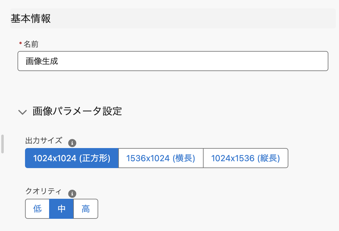 | クオリティ | 生成される画像の品質を選択します。高クオリティほど詳細な画像が期待できますが、生成に時間がかかったり、コストに影響したりする場合があります。 | 用意された選択肢から選択: ・低 ・中 ・高 |