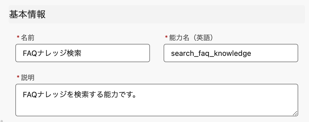 | 説明 | この能力が何をするのかについての説明文です。 | エージェントが読んでも内容が理解できるように、具体的な説明を入力します。 |