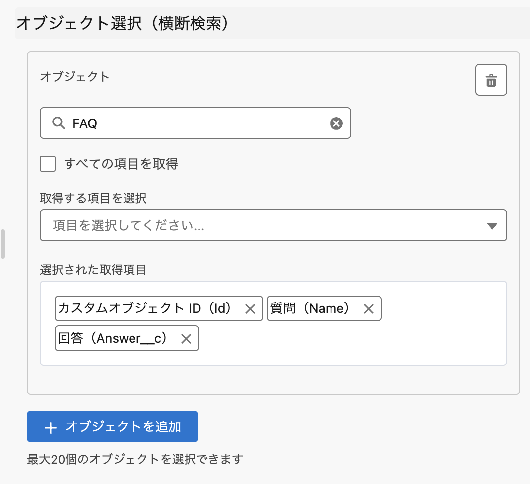 オブジェクトと項目を選択します。取得する項目として選択された項目が、形態素解析で検索が行われる項目となります。