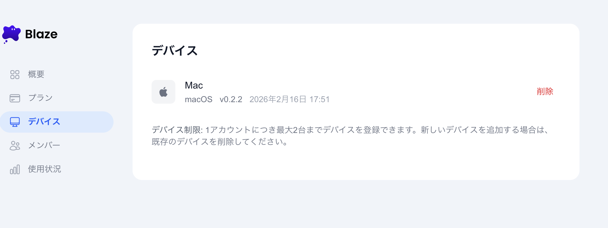 - Blazeは1アカウントあたり最大2台のデバイスで利用できます。
