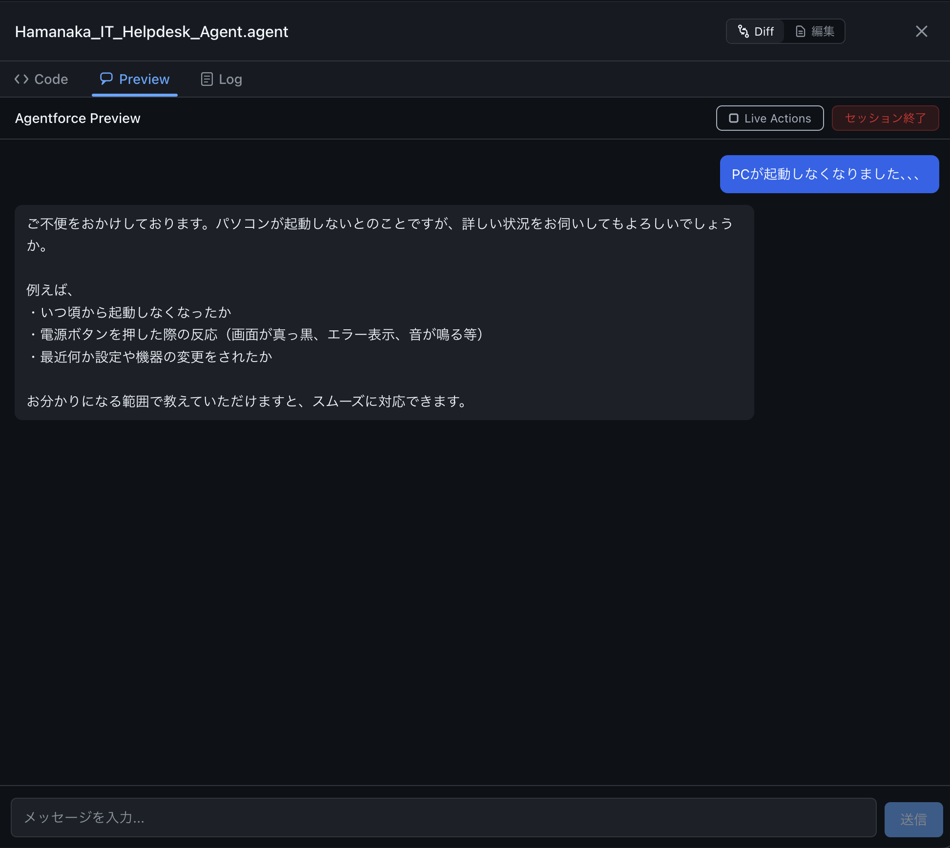 Agentforceのメタデータファイル(.agent、.bot-meta.xml など)を開くと、Code / Preview / Log の3つのタブが表示されます。
