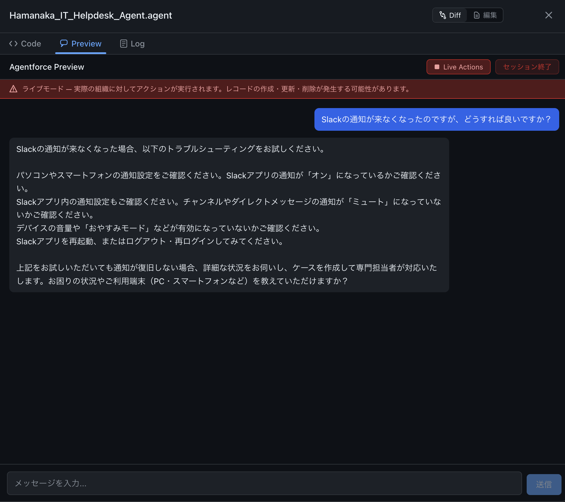 - Live Actions ボタンをオンにすると、エージェントのアクション(Apex、フロー、API呼び出し)が実際のSalesforce組織に対して実行されます