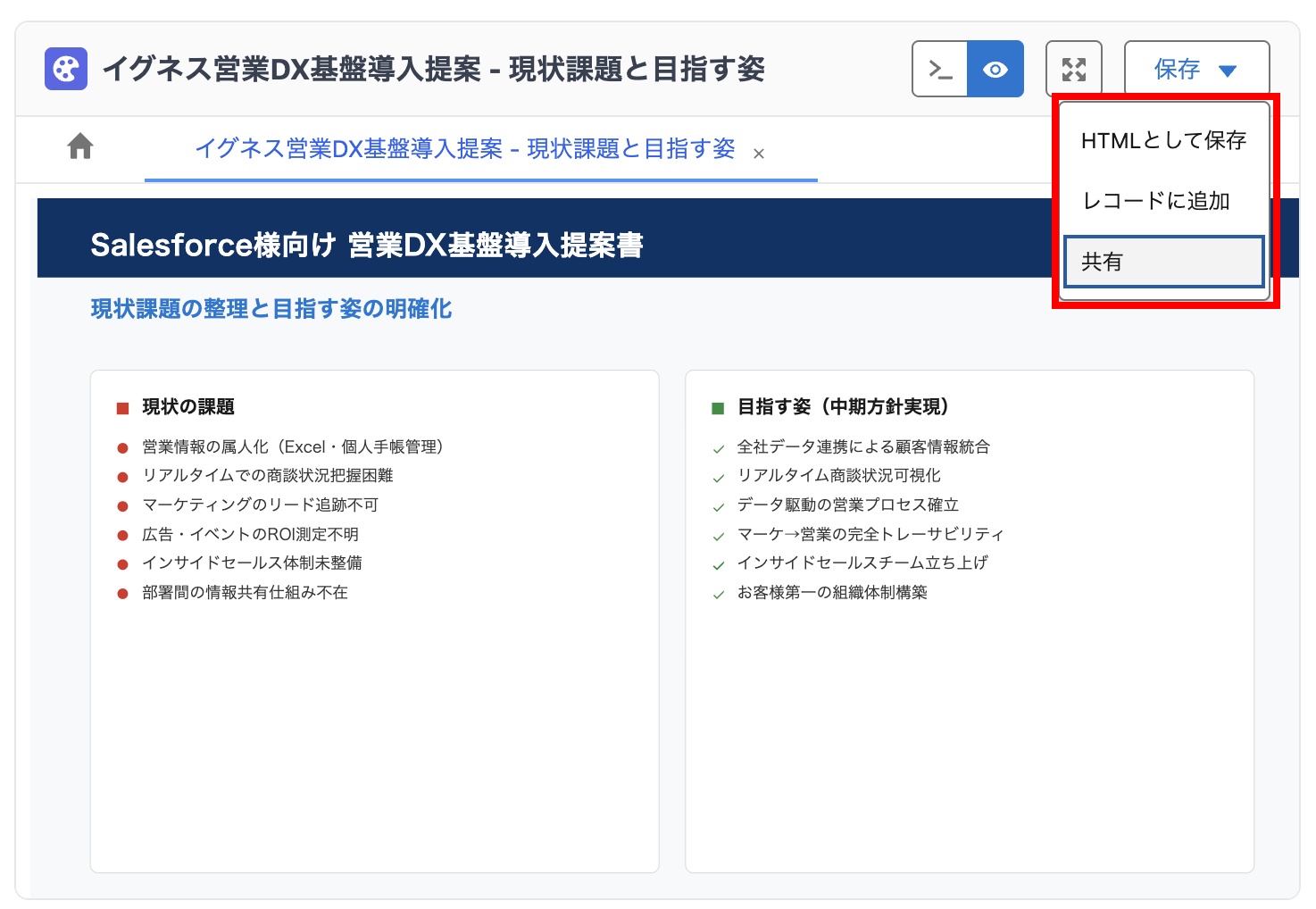 社外のメンバーに共有することができます。詳しくは以下をご参照ください。なお、Salesforce レコード上で共有すると自動的にそのキャンバスが紐づくレコードに追加されます。