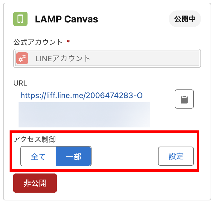 LAMPキャンバスを公開したあと、共有先を指定することができます。共有先を「全て」に設定すると、LINEログインしているすべてのユーザーに公開されます。