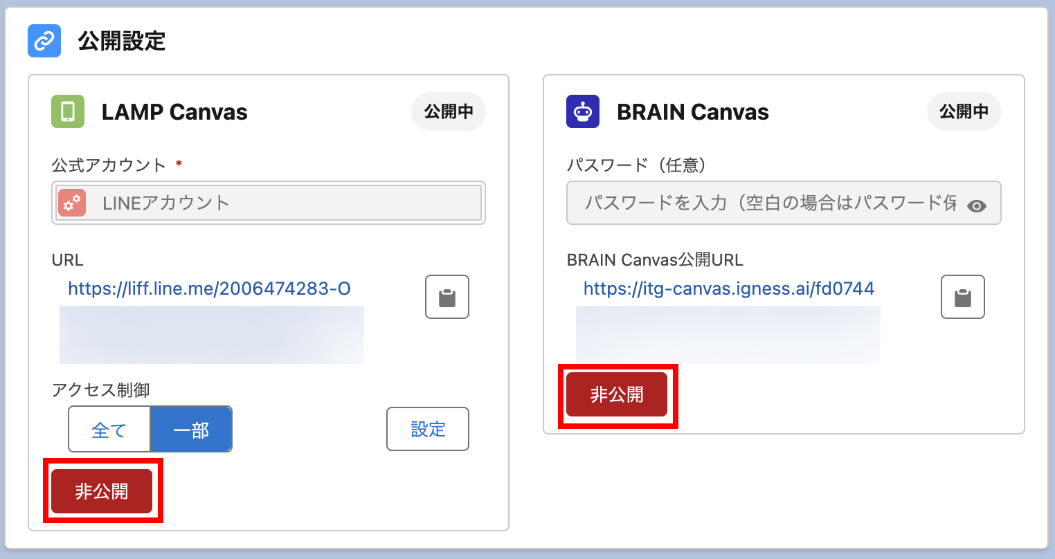 LAMPキャンバスもしくはBRAINキャンバスかを選び、「公開」ボタンをクリックします。