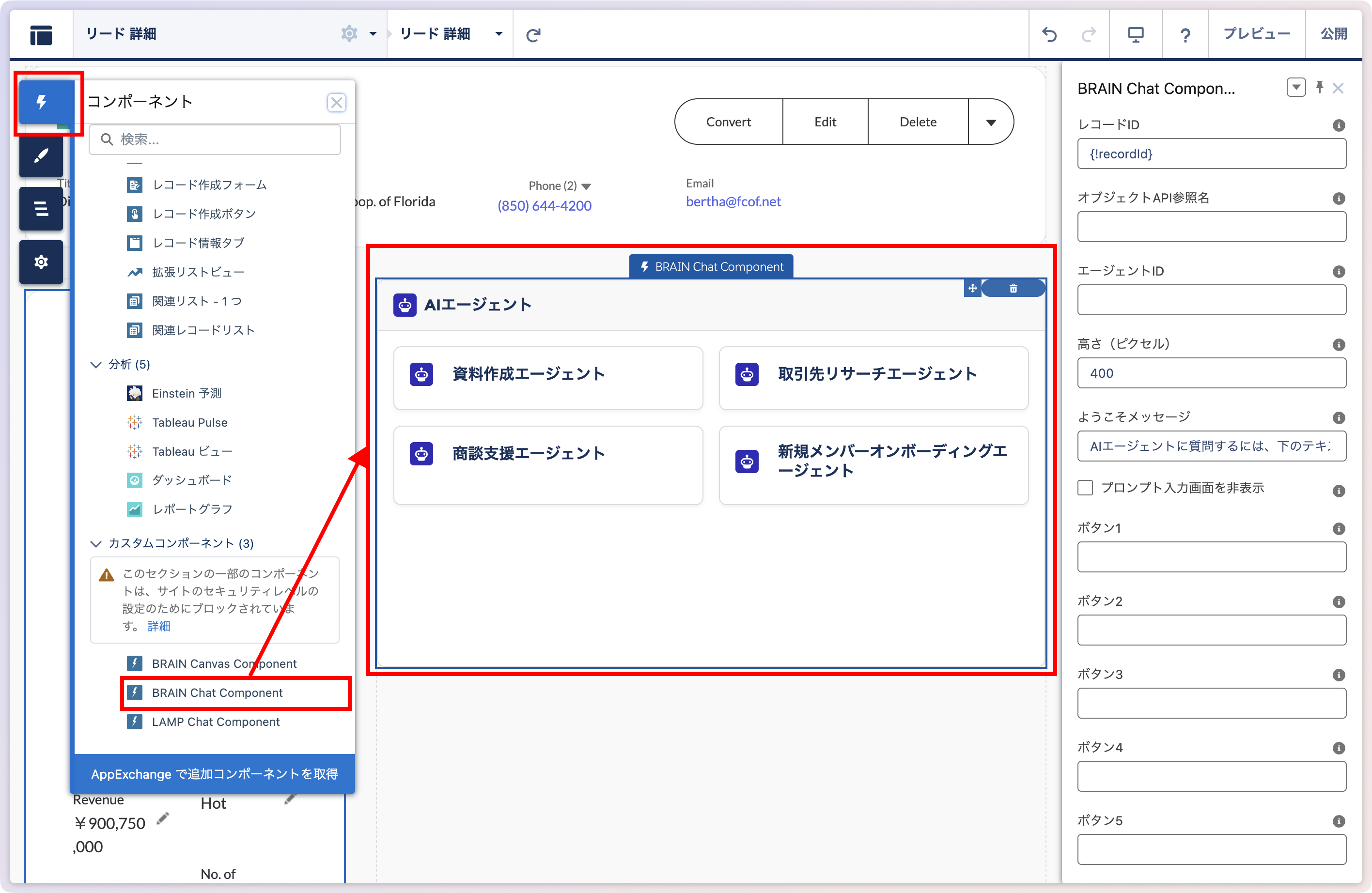 エージェントを設置したいエクスペリエンスサイトのページを開き、コンポーネントから[BRAIN Canvas Component]をページにドラッグ&ドロップします。