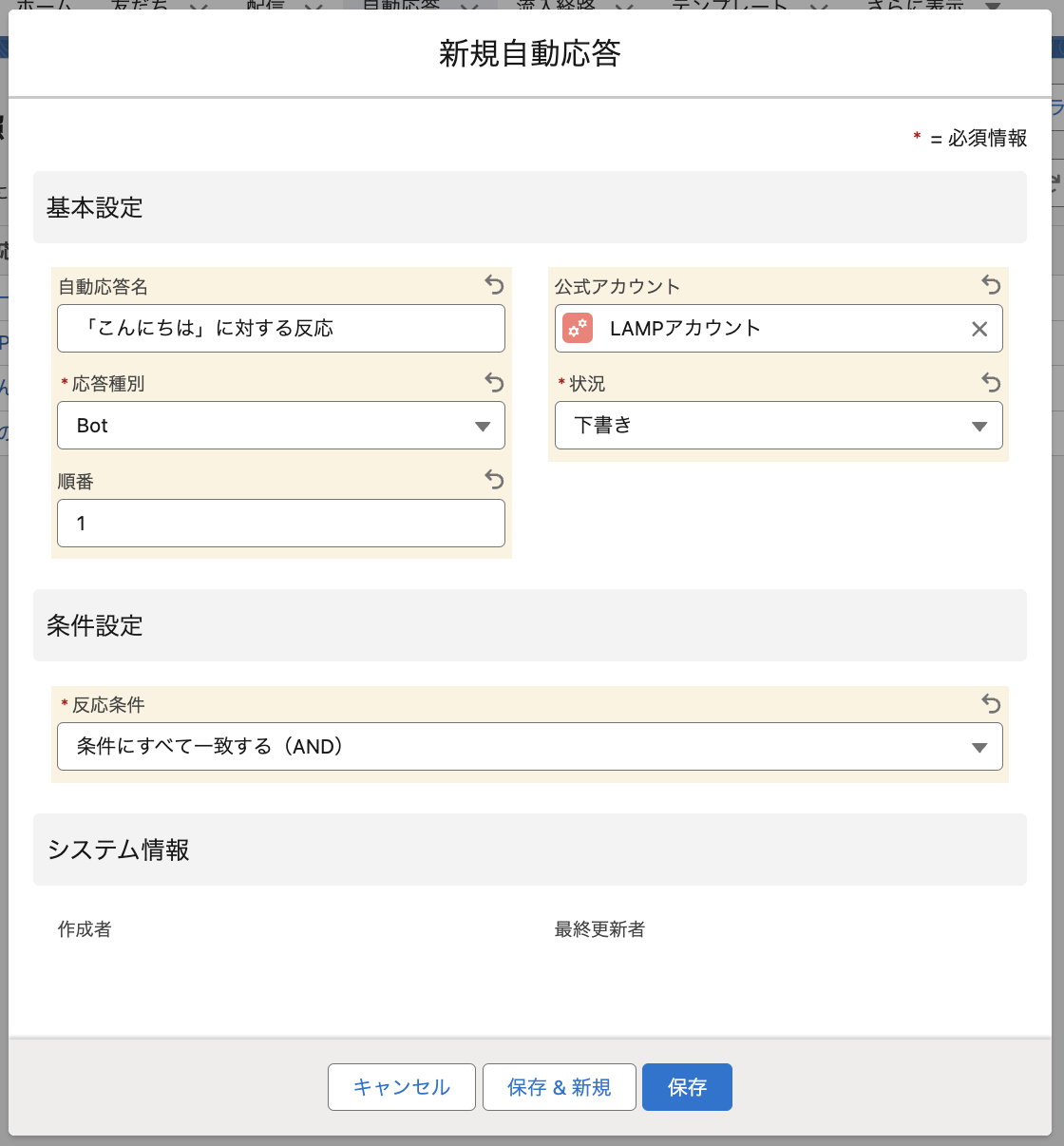 自動応答名、応答種別、反応する順番、公式アカウント、状況、反応条件を入力しておきます。