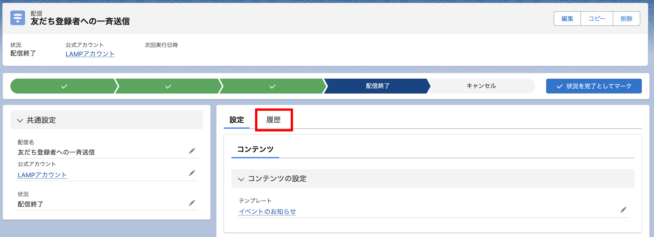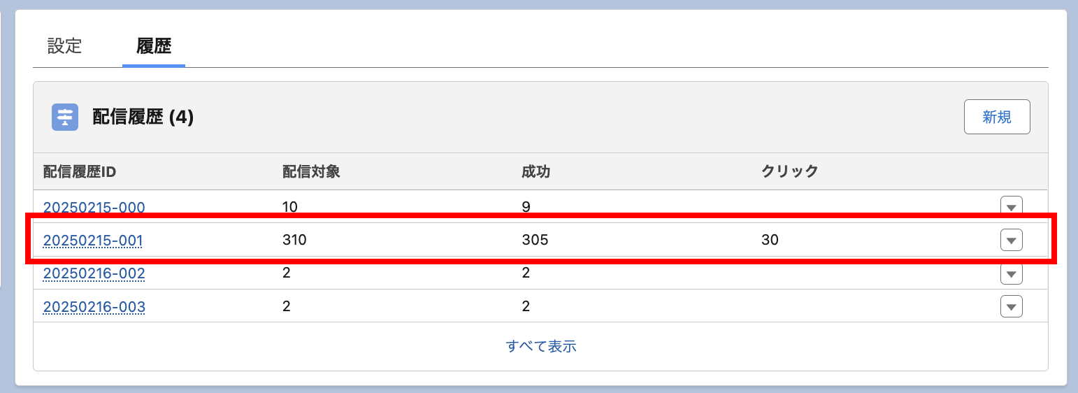 配信履歴があるので、配信履歴レコードを開くと統計情報を確認することができます。