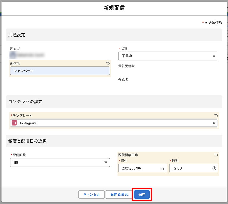 [配信]タブより[新規]をクリックして配信設定をおこないます。