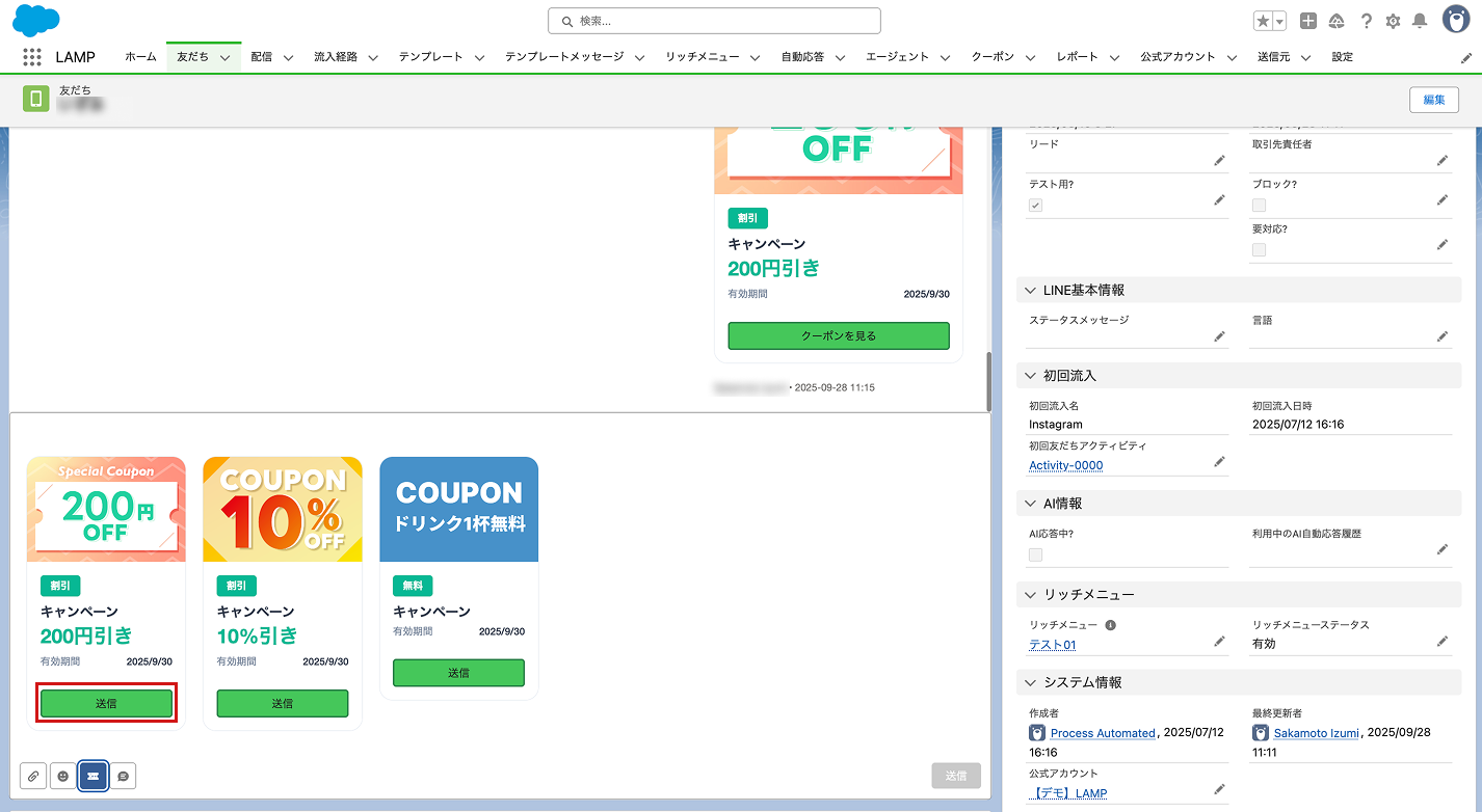 利用できるクーポンが一覧表示されているので、送信したクーポンの「送信」ボタンをクリックします。