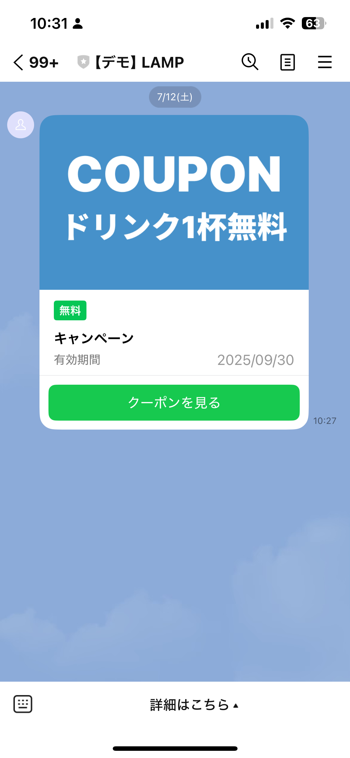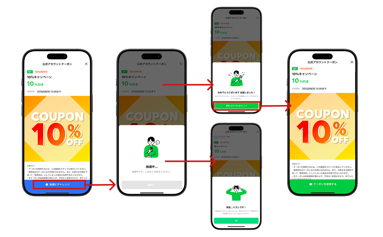 LAMPで発行したクーポンは、LINEに送信することで以下の流れで使用します。
