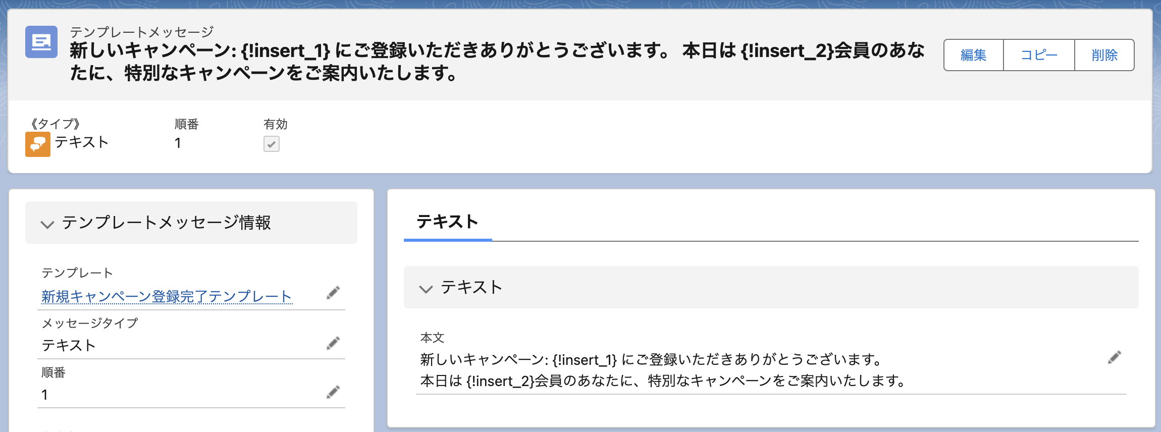 今回は、{!insert_1} にはキャンペーン名を、{!insert_2}には、[ゴールド]という文字列をそれぞれ変数として代入することを例に設定をします。