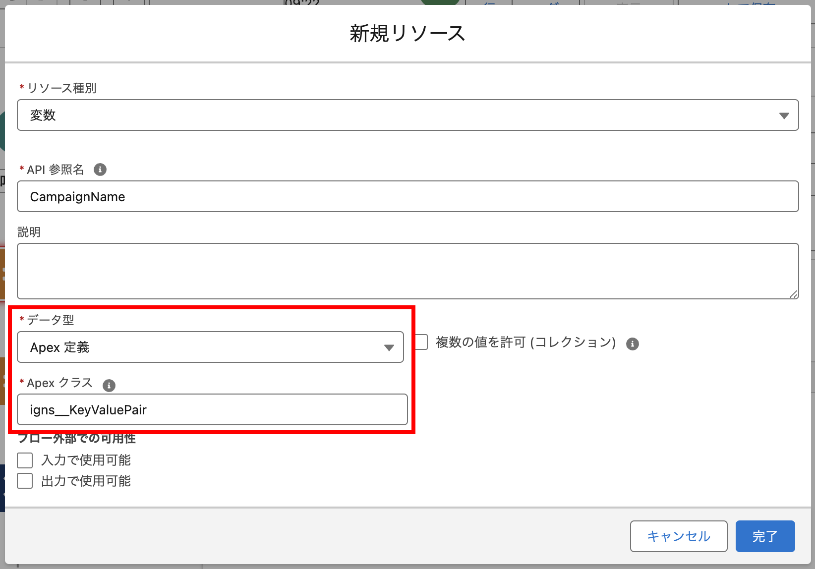 | API参照名 | 任意の変数名(今回はCampaignName)を入力 |