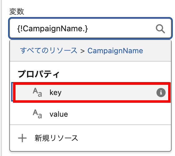 変数の入力欄が {!CampaignName.} に変わりました。ここで、プロパティより key を選択します。