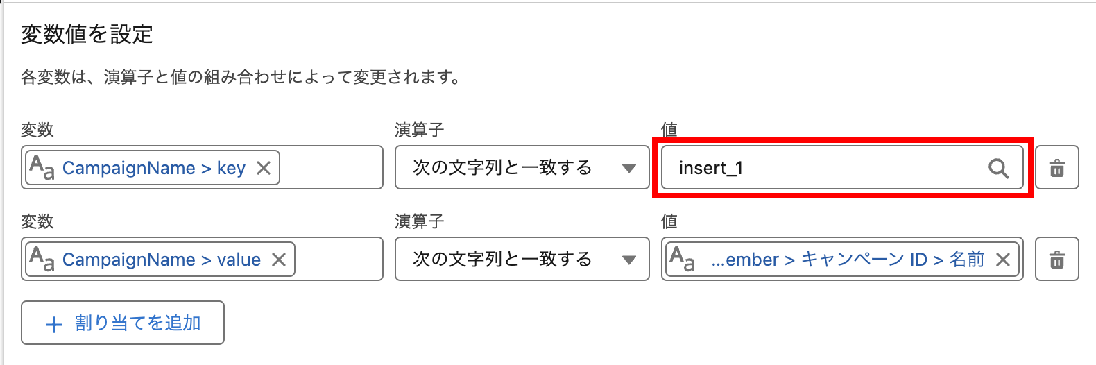 おなじように、 CampaignName > value の変数も用意し、ここにはキャンペーンの名前を選択して選びます。