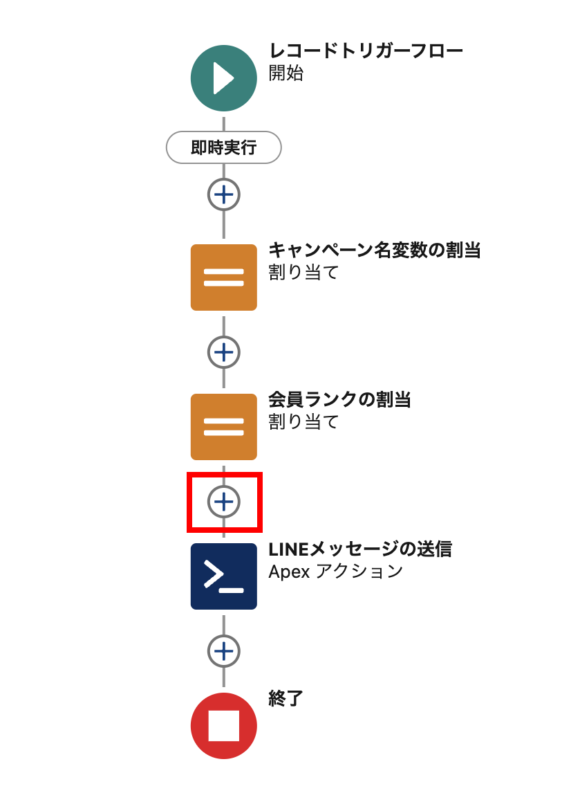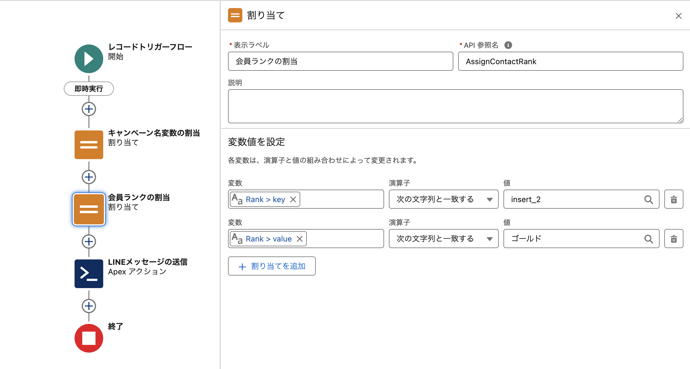 LINEメッセージの送信 Apexアクションの前で、変数コレクションへの変数割当を行います。