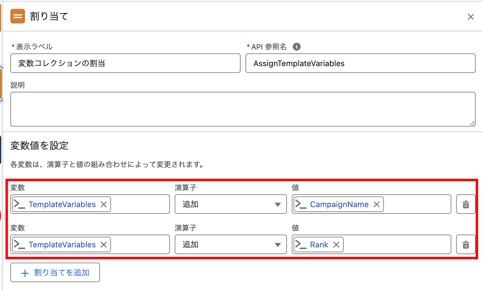 [要素の追加]より、「割り当て」をクリックして割り当て要素を追加します。