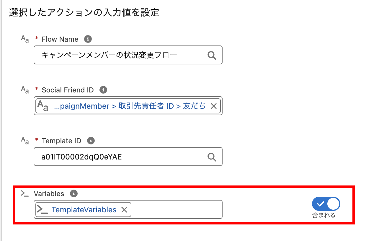 上記のように、 {!Name}などの友だちオブジェクト差し込み項目はフローで割当設定しなくても利用できます。