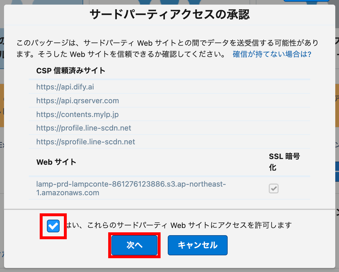 「はい、これらのサードパーティWebサイトにアクセスを許可します」にチェックを入れて[次へ]をクリックします。