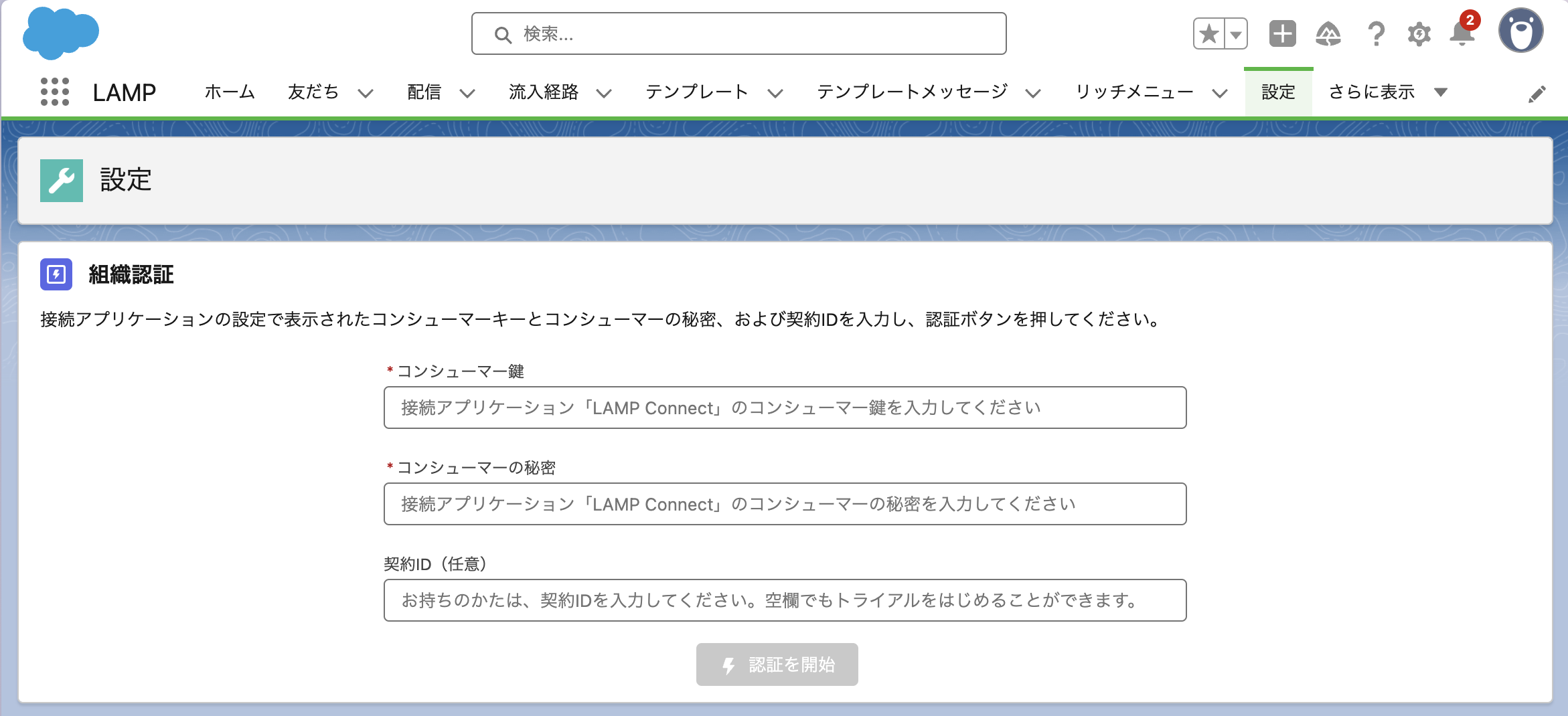 組織認証の画面が表示において、さきほどコピーしたコンシューマー鍵とコンシューマーの秘密を入力します。