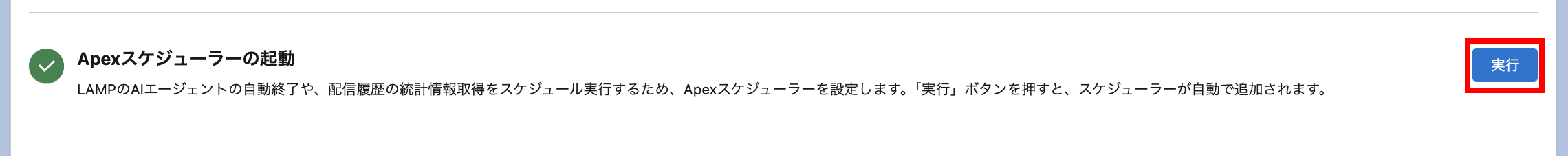LAMP設定アシスタントの「Apexスケジューラーの起動」セクションにある「実行」ボタンをクリックするとスケジューラーが起動します。必ず実行ボタンをクリックしてご利用ください。