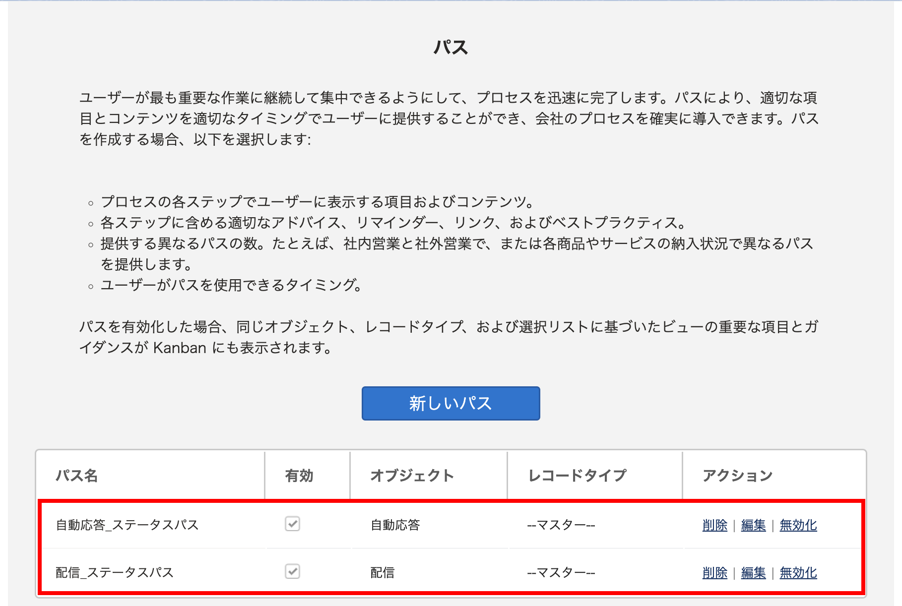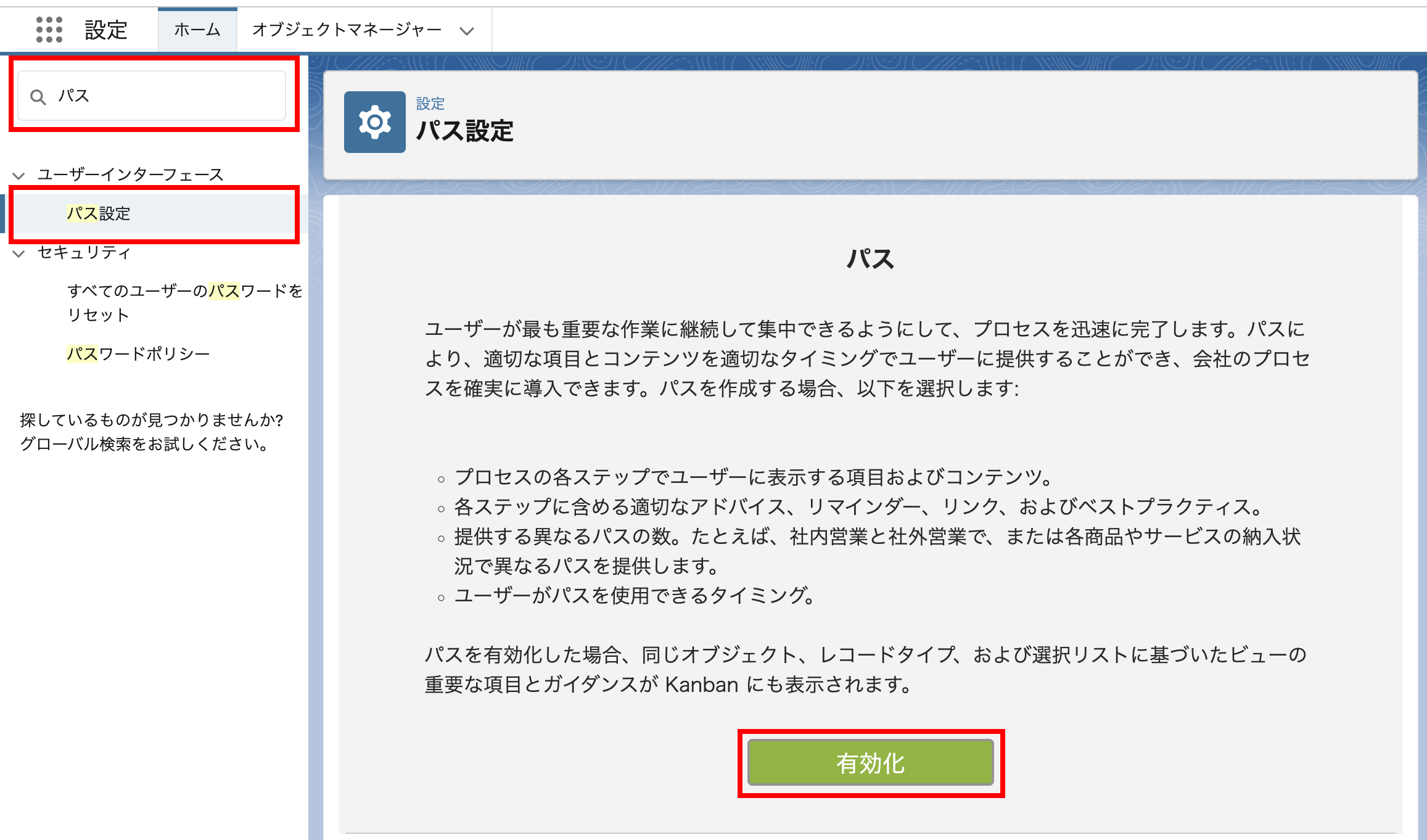 Salesforceの設定画面に遷移し、検索BOXに「パス」と入力します。