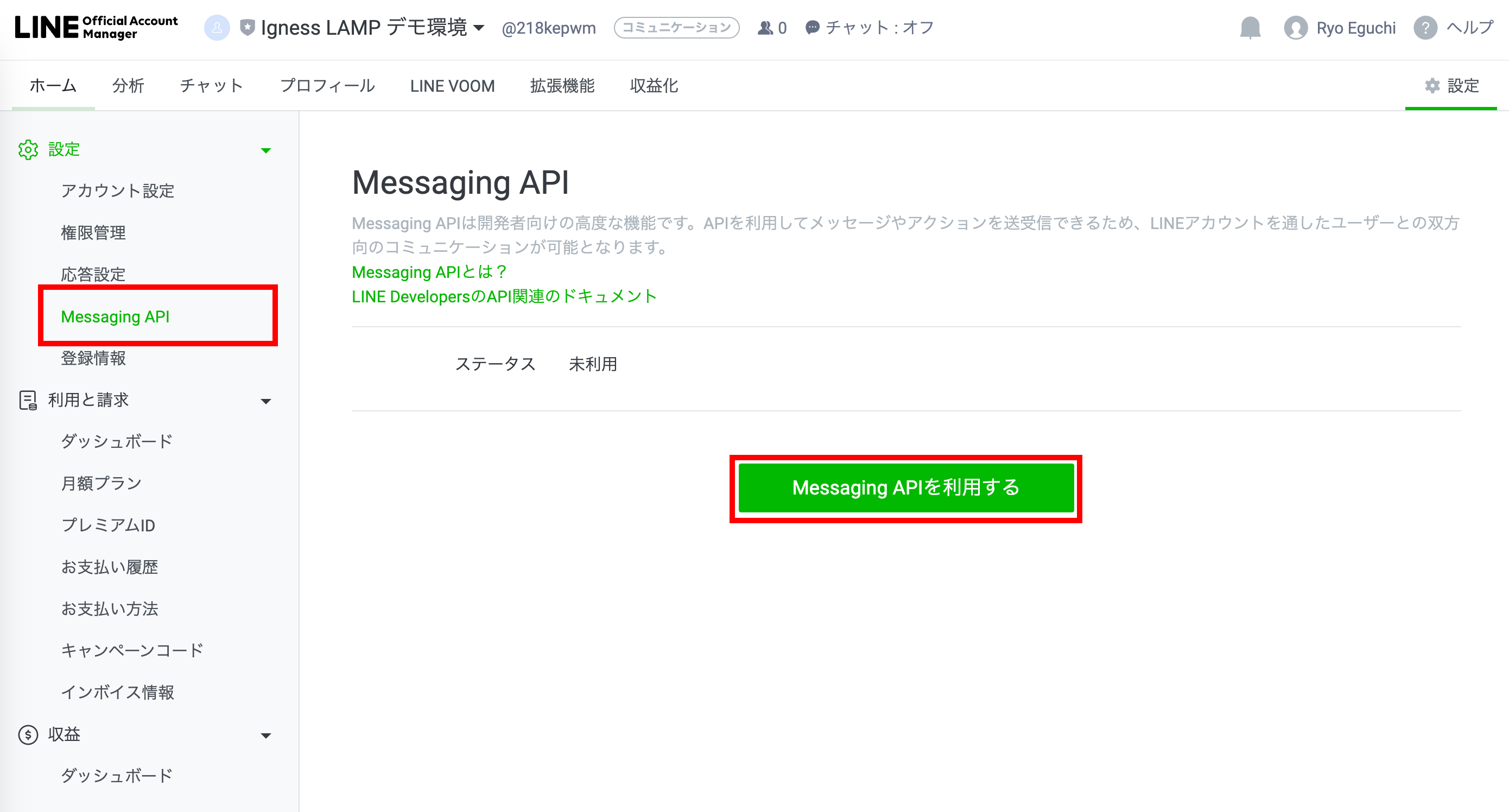 「Messaging API設定」タブを開きます。