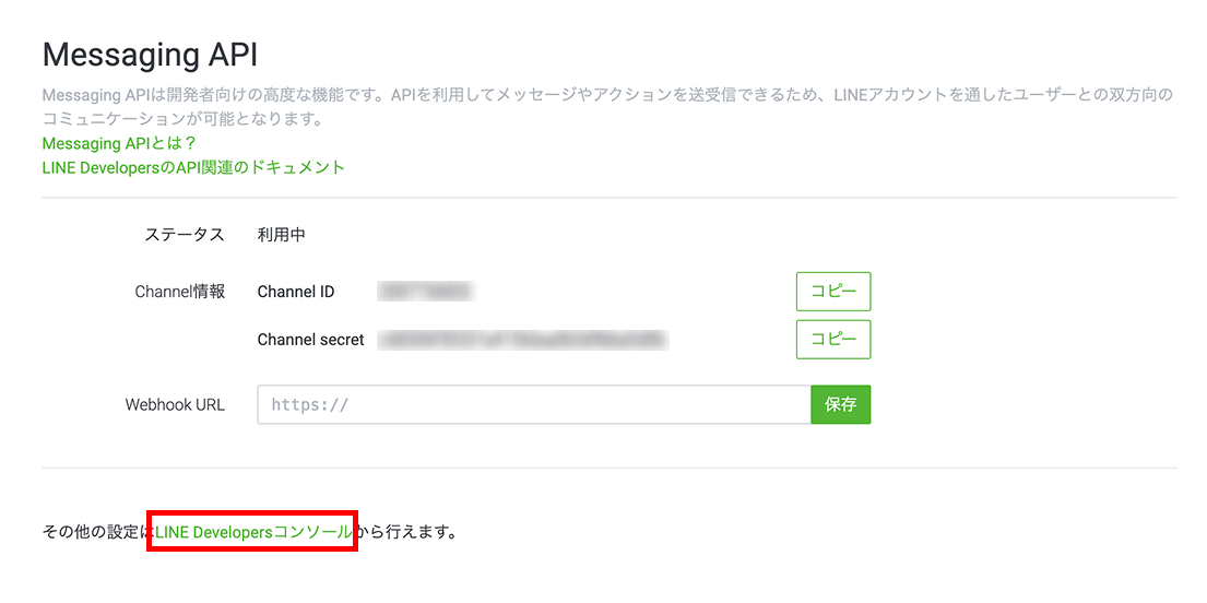 LAMPサーバーとLINEを連携するため、Webhook URLを設定します。
