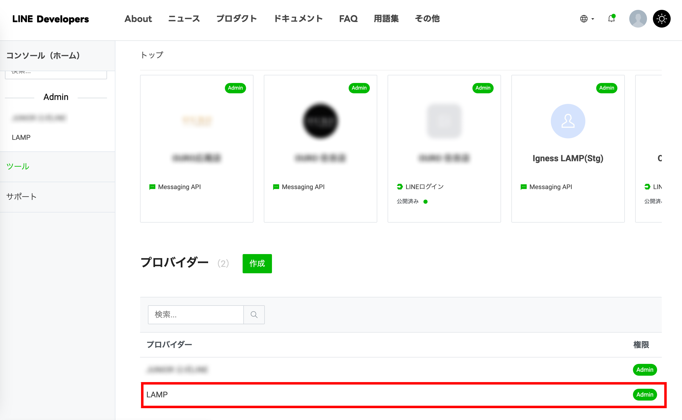 LINE Developers の公式ページより、「コンソール」をクリックしてコンソールを表示します。