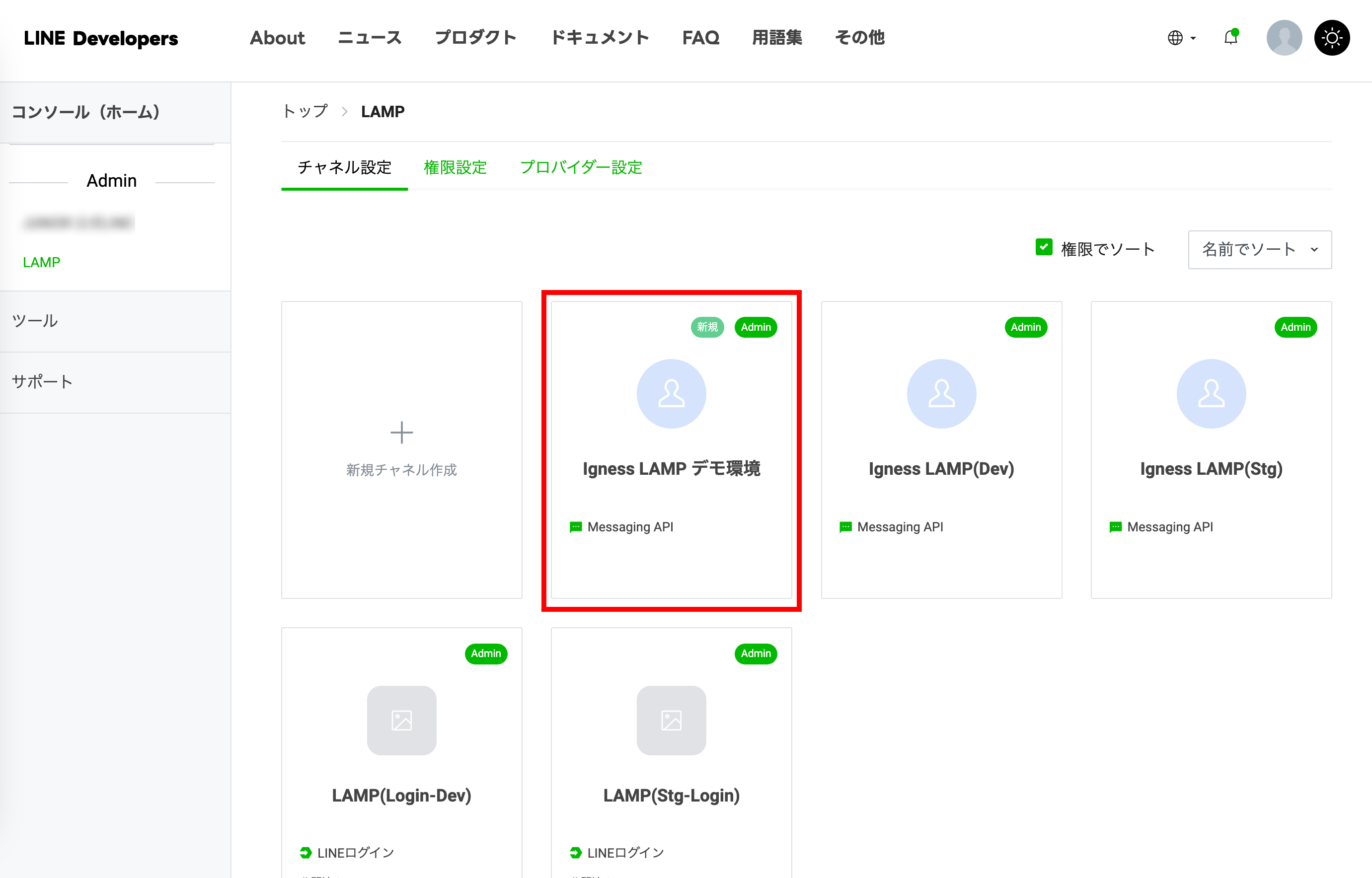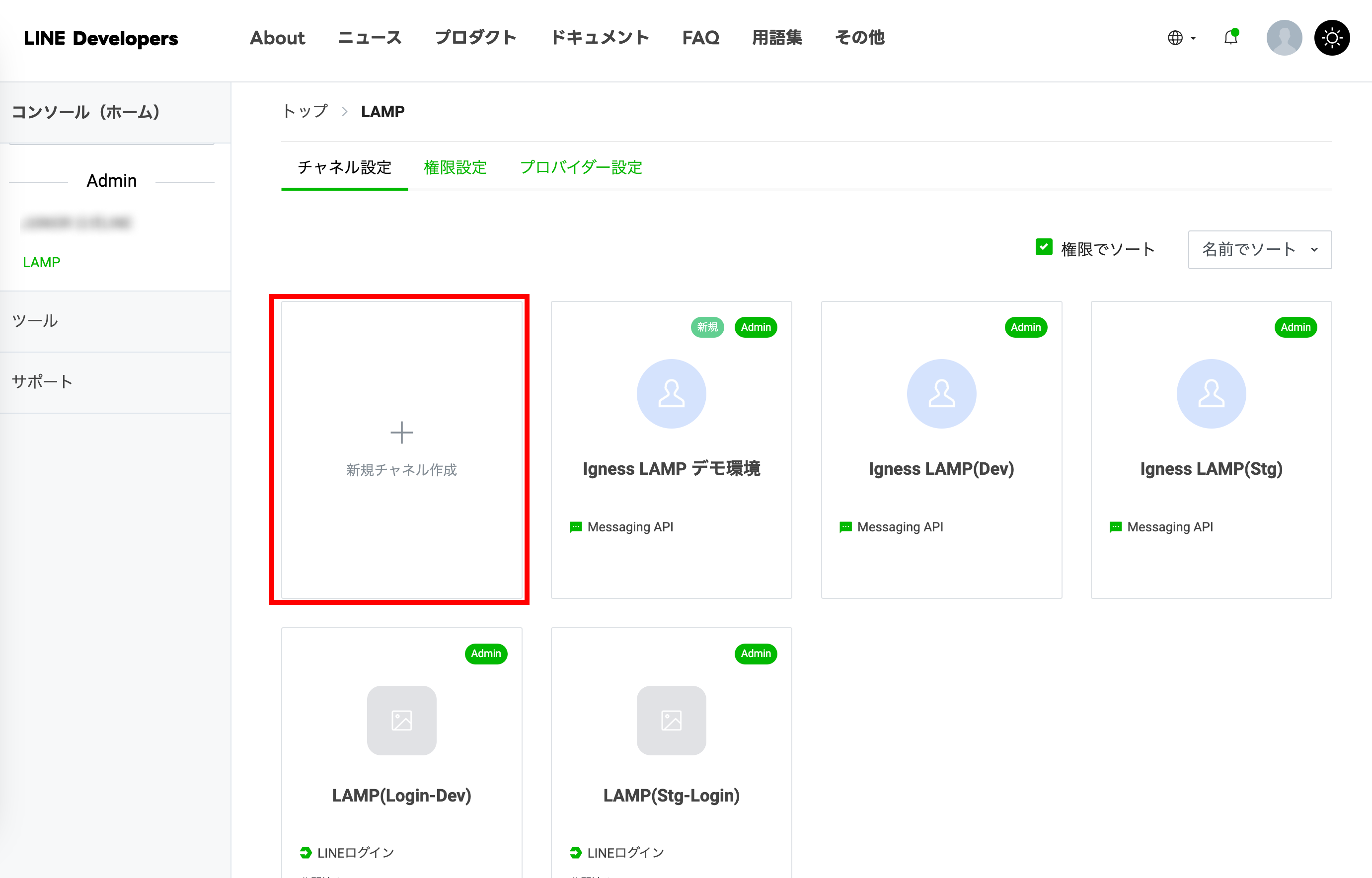 プロバイダの「チャネル設定」のページにて「新規チャネル作成」をクリックします。