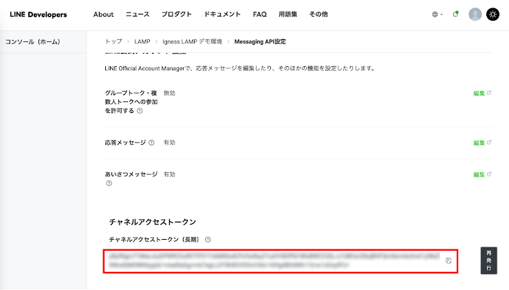 | チャネルアクセストークン(長期) | Step.2-2で取得したチャネルアクセストークン |