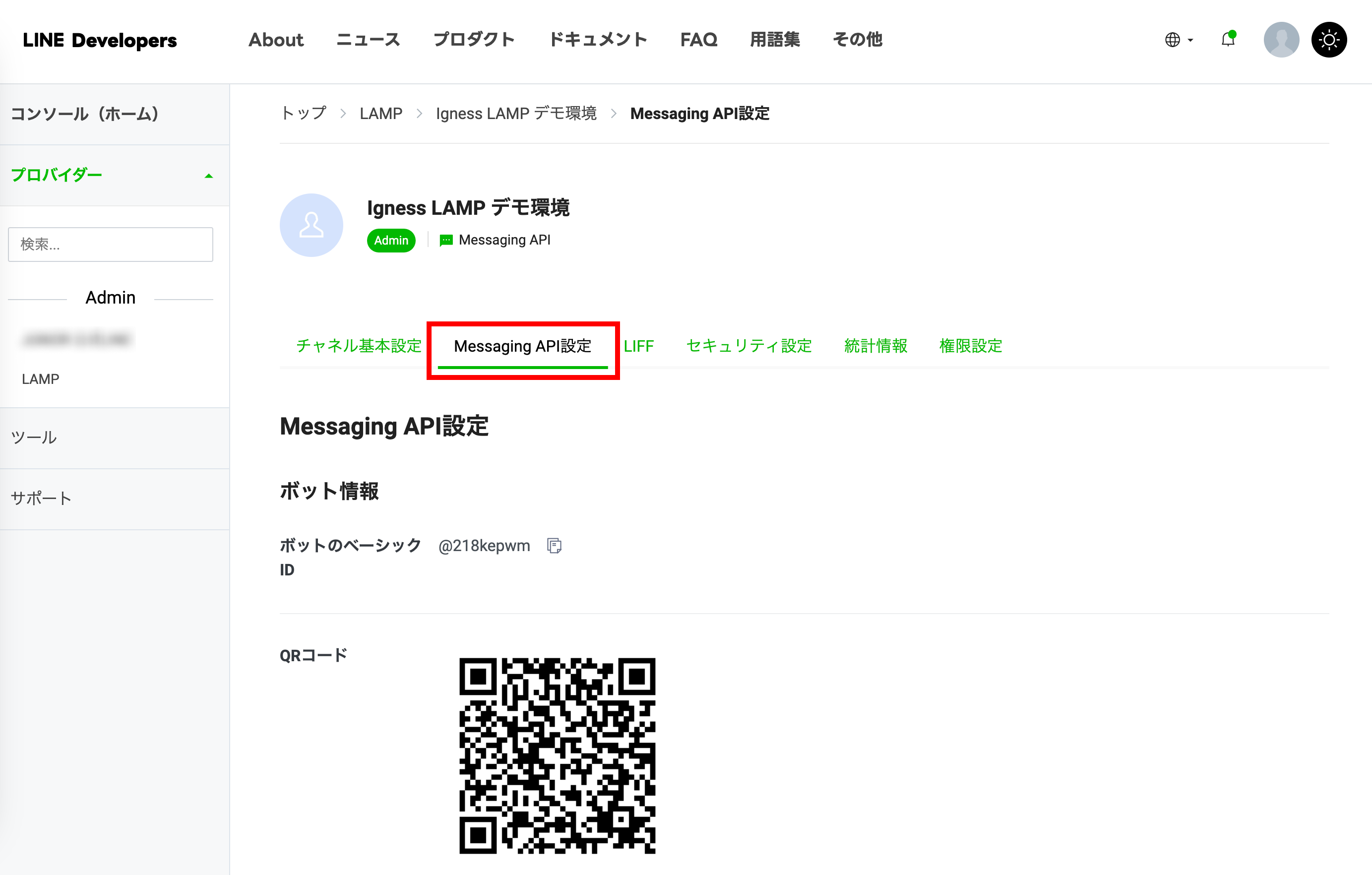 「Messaging API設定」タブを開きます。