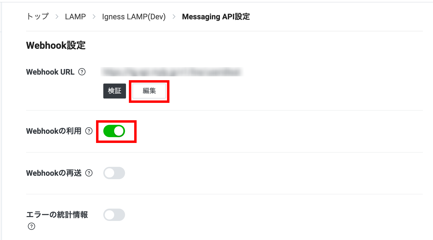 LAMPサーバーとLINEを連携するため、Webhook URLを設定します。