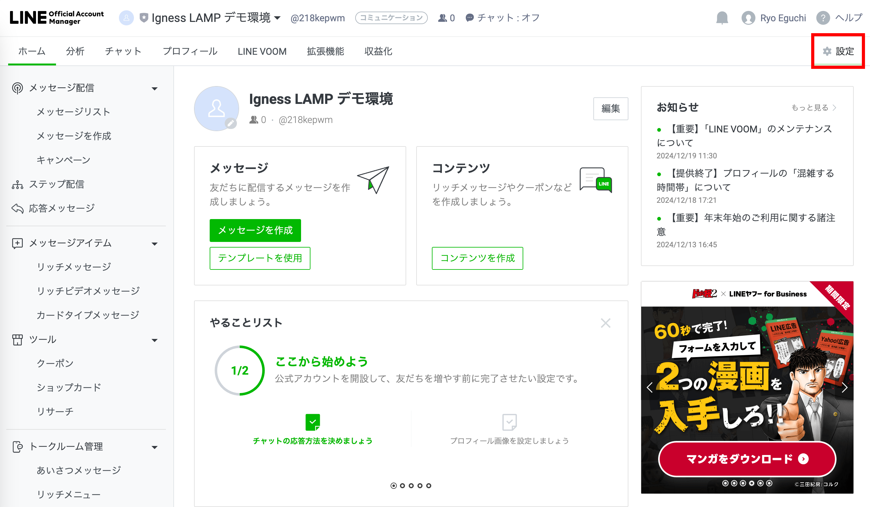 LINE公式アカウントマネージャ画面より、右上の「設定」ボタンをクリックします。