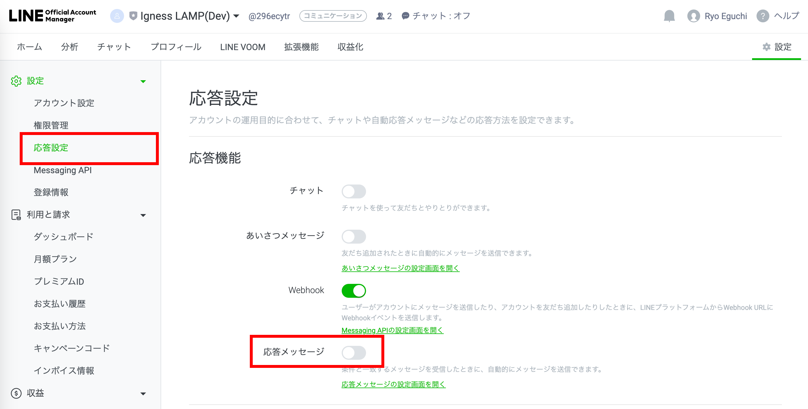 - LINE公式アカウントマネージャでの「応答メッセージ」の無効化手順