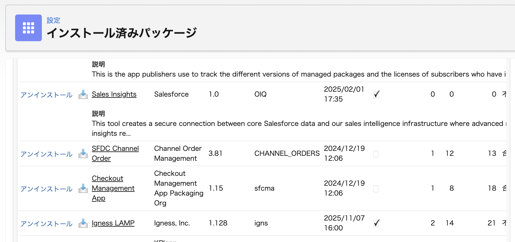 「権限セット」を開きます。LAMPやBRAINに関する権限セットを開き、権限セットの割当をすべて削除します。