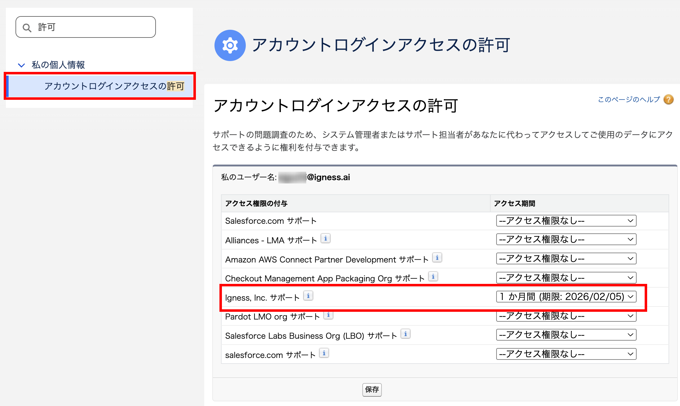 [Igness, Inc. サポート] の [アクセス期間] ドロップダウンリストから任意の期間 (通常 1 週間、技術的なエスカレーションには最低 1 か月) を指定して、[保存]をクリックします。
