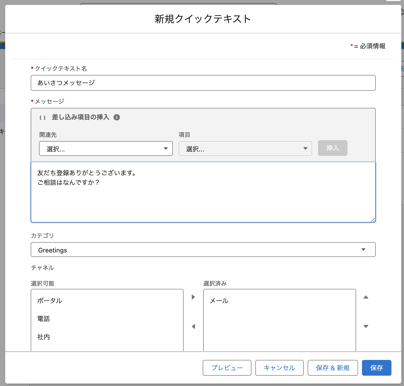 クイックテキスト名とメッセージを入力して「保存」ボタンをクリックします。