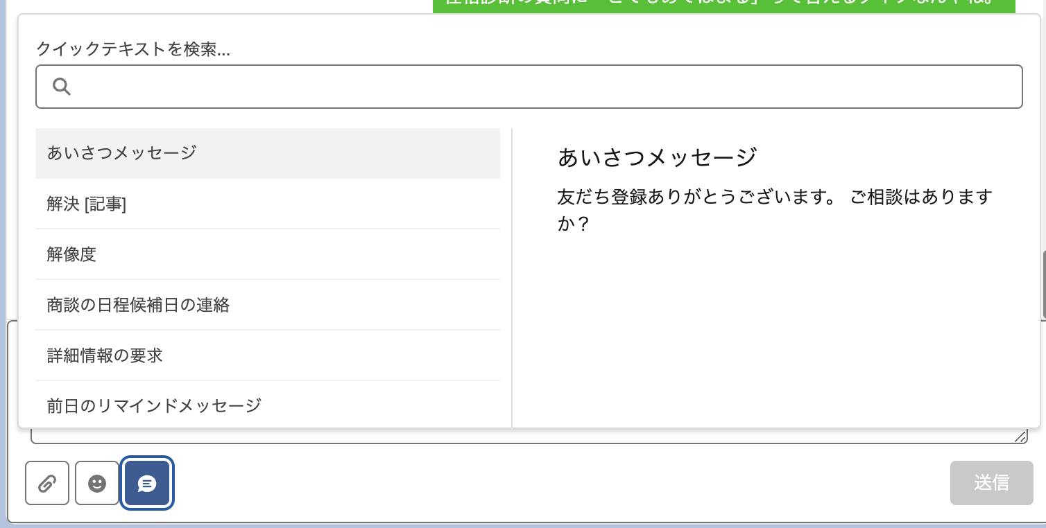 メッセージ画面より「クイックテキスト」アイコンをクリックすると、クイックテキストが開かれます。