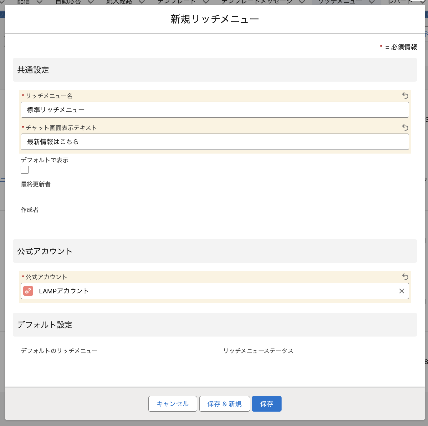 | リッチメニュー名 | Salesforce内で利用する名前です。お客様には表示されません。 |