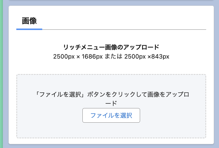 右下の「リッチメニュー画像のアップロード」画面にて、[ファイルを選択]ボタンをクリックして画像をアップロードしてください。
