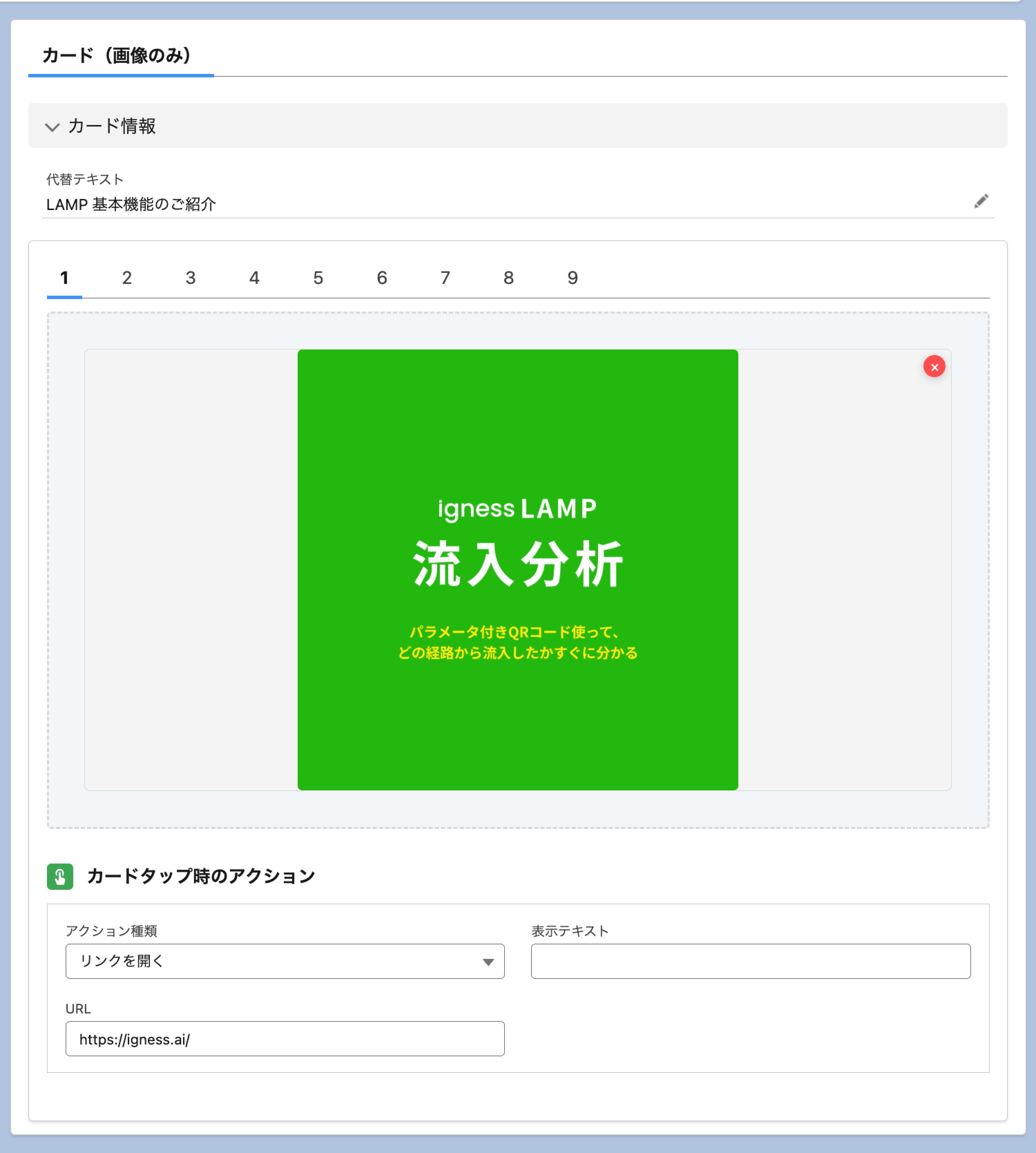 1つのカード型(画像のみ)メッセージにつき、最大9個のカードを設定することができます。