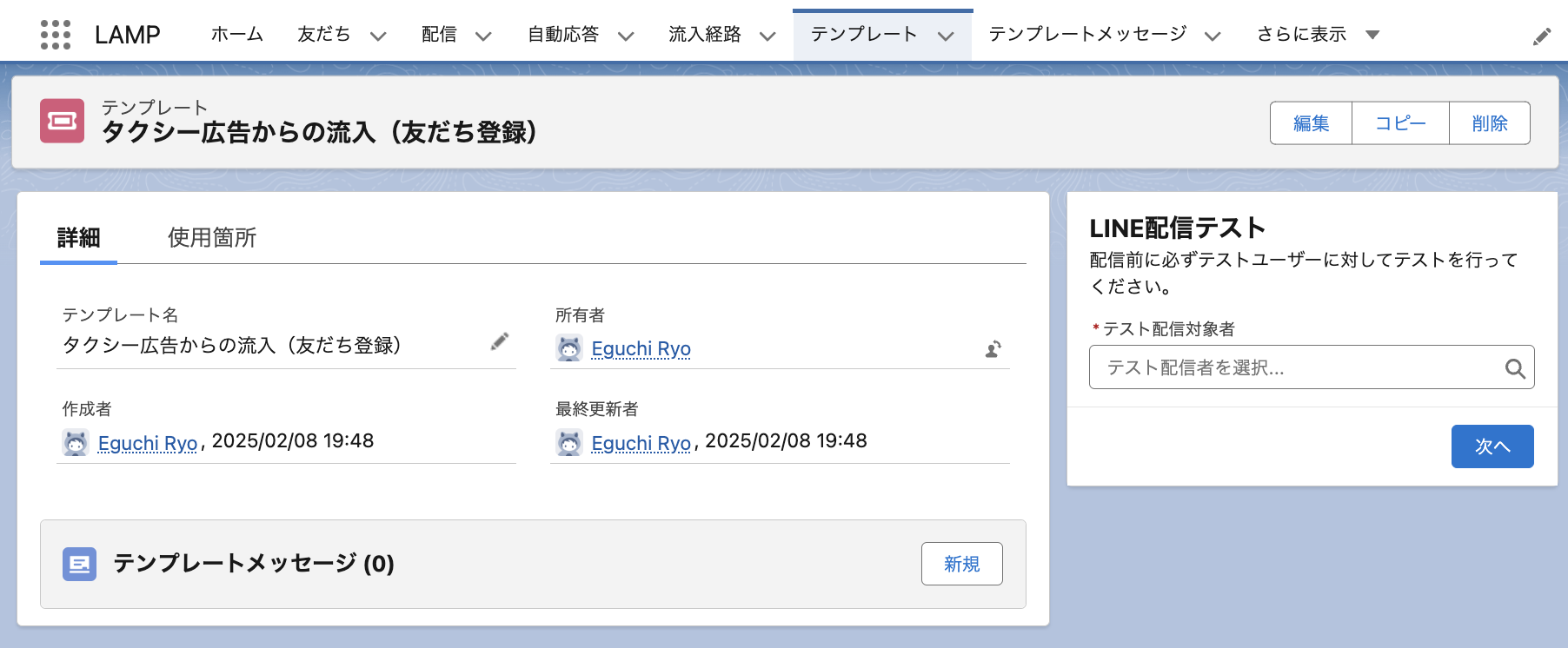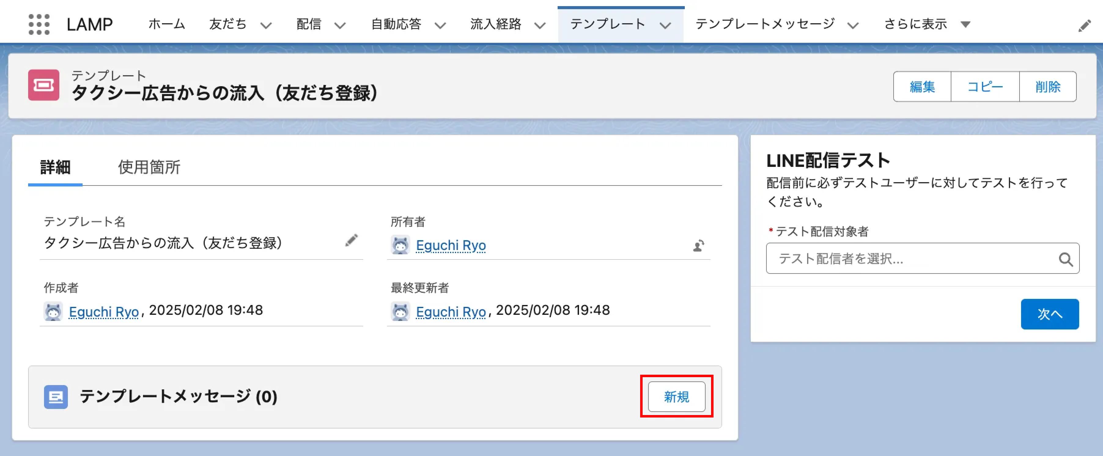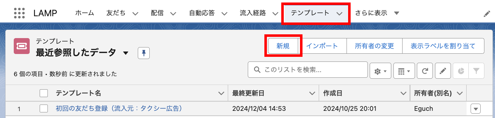 「テンプレートメッセージ」関連リストの[新規]より、テンプレートメッセージを作成します。