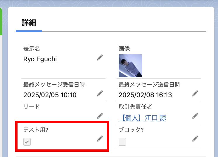テスト配信対象者には、友だちオブジェクトにて「テスト用?」にチェックが入っているレコードだけが表示されます。「テスト用?」にチェックを入れてください。